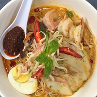 Mixed thin yellow noodles and thin Bee-Hoon (rice vermicelli) served with a spicy coconut milk curry broth. Topped with condiments such as fried tofu, fish cakes, bean sprouts and hard-boiled egg slices plus addition of cockles and prawns