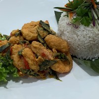 Batter fried fresh prawns hot stir fry with salted duck egg yolk, mixed with our home-made sauce, chili, curry leaves served with Rice