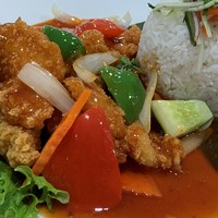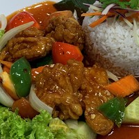 Crisp chicken hot stir with our tangy sweet sour sauce, vegetables and served with Rice. Must try!